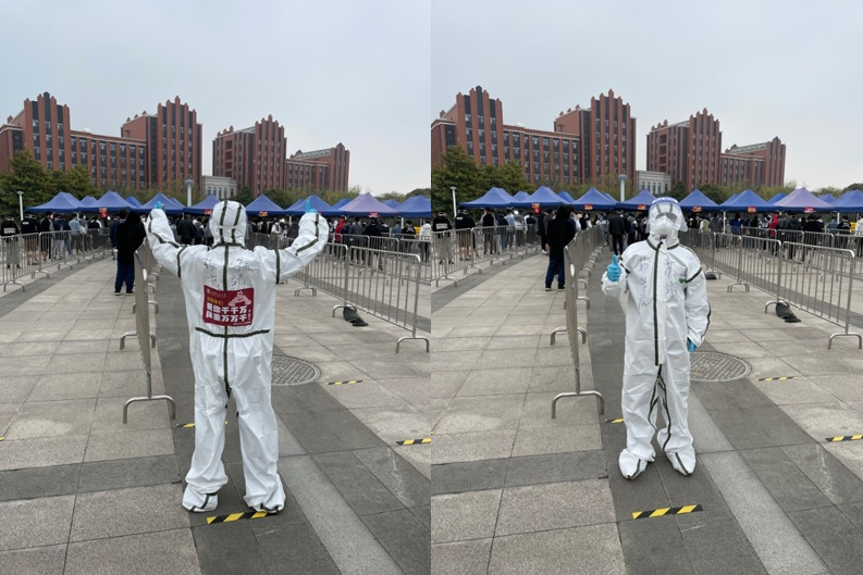 苏靖同志第一批加入了学校教职工自发组织的志愿者队伍,在学校楼栋封控管理期间,每天与学院办公室主任李伟同志以及尹君杰博士生为西54栋的同学们送上一日三餐。老师们穿着厚厚的防护服,口罩和手套,开着自己的私家车完成送餐,每次送完衣服都会被汗水浸湿,遇到雨天甚至浑身都会被雨淋透;此外,苏靖同志还加入了校核酸测试的志愿者队伍,面对学校3万多名师生的核酸测试需求,苏靖同志作为众多志愿者岗位上的一员,坚守在学校抗疫的最前线,与院办公室主任李伟同志以及学校其他学院、机关部处等同志一起,在人手不足的情况下,保障了全校师生一轮又一轮的核酸检测。