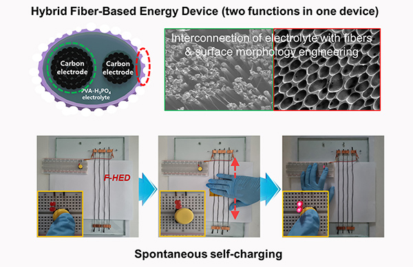 The published article based on a research project sponsored by National Natural Science Foundation of China (NSFC) presents a unique device structure which enables the spontaneous self-charging mechanism for wearable devices. Despite that the concept of the self-charging has been introduced, most of the self-charging was achieved in the form of two-functions-in-two-devices. In the research work of Dr. Cho, the devices exhibit the self-charging mechanism in the form of two-functions-in-one-device. In addition, a template-free scalable method was introduced to build wearable devices with high controllability of key device parameters. This led to the improved electrochemical behaviors as well as energy harvesting performance, achieving the enhanced spontaneous self-charging at the building block fiber scales (Figure below).