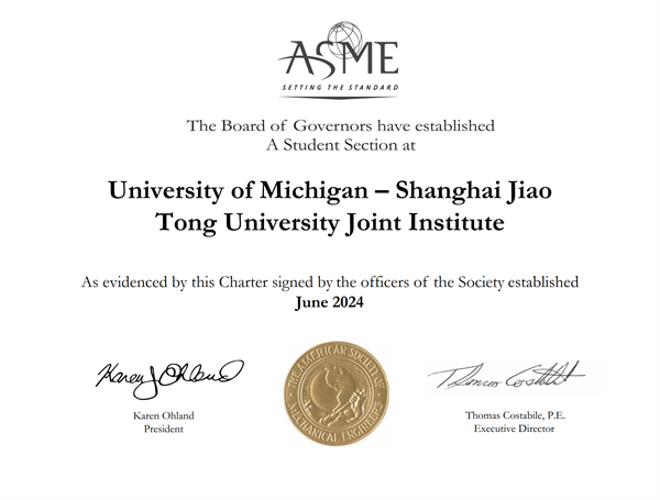 The University of Michigan-Shanghai Jiao Tong University Joint Institute (UM-SJTU JI, JI hereafter) has announced the establishment of its American Society of Mechanical Engineers (ASME) Student Section, following the receipt of the official certificate from the US-based non-profit professional association. This milestone marks the first ASME Student Section on the SJTU campuses.