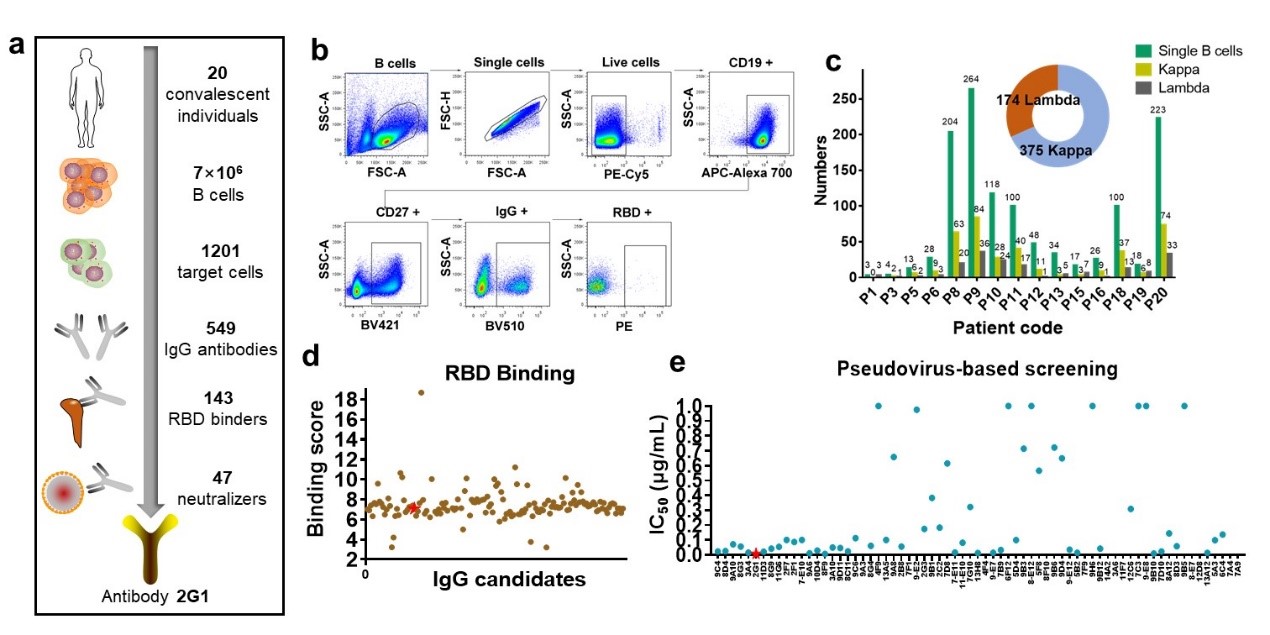 该研究首先采集了新冠康复患者的血液样本,从中分离得到了记忆B细胞,然后克隆得到了数百个IgG抗体分子。通过一系列的结合能力筛选以及假病毒中和实验筛选,最后得到了数十个候选抗体(图1)。在这些候选抗体中,2G1表现出了最强的中和活性,因此对其做了进一步评价。