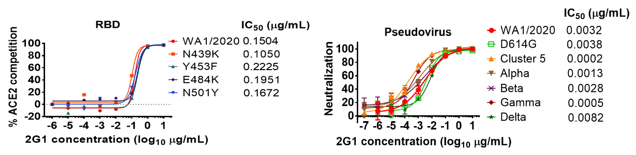 随后研究团队探索了一些主要突变位点和主要突变毒株对抗体2G1活性的影响,发现N439K、Y453F、E484K和N501Y等突变位点以及Alpha、Beta、Gamma和Delta等引起担忧的毒株均对2G1的活性不构成显著影响(图2)。抗体2G1与主要突变毒株具有纳摩尔级的亲和力。这表明抗体2G1抗突变能力良好,对SARS-CoV-2具有广泛的中和能力。
