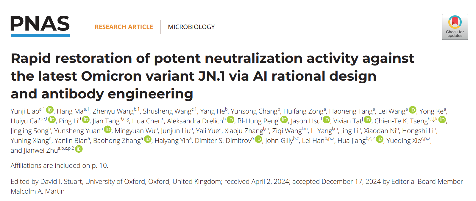 为应对病毒的快速变异,朱建伟团队基于现有抗体研究成果,结合人工智能快速优化中和抗体,显著地恢复了中和抗体的活性。通过一系列AI辅助抗体结构优化设计,结合实验室的验证,团队迅速提高了抗体对新变异株的适应性,对新近流行的病毒突变株JN.1的中和活性提高几百到1500倍,更重要的是,建立了一种针对疾病靶点突变后应用AI辅助快速开发新药的方法,为今后创新抗体类药物甚至其他药物的开发提供了具有实践可行的新的途径。该研究成果已在国际著名期刊The Proceedings of the National Academy of Sciences of the United States of America (PNAS) 上发表,题为:Rapid restoration of potent neutralization activity against the latest Omicron variant JN.1 via AI rational design and antibody engineering。