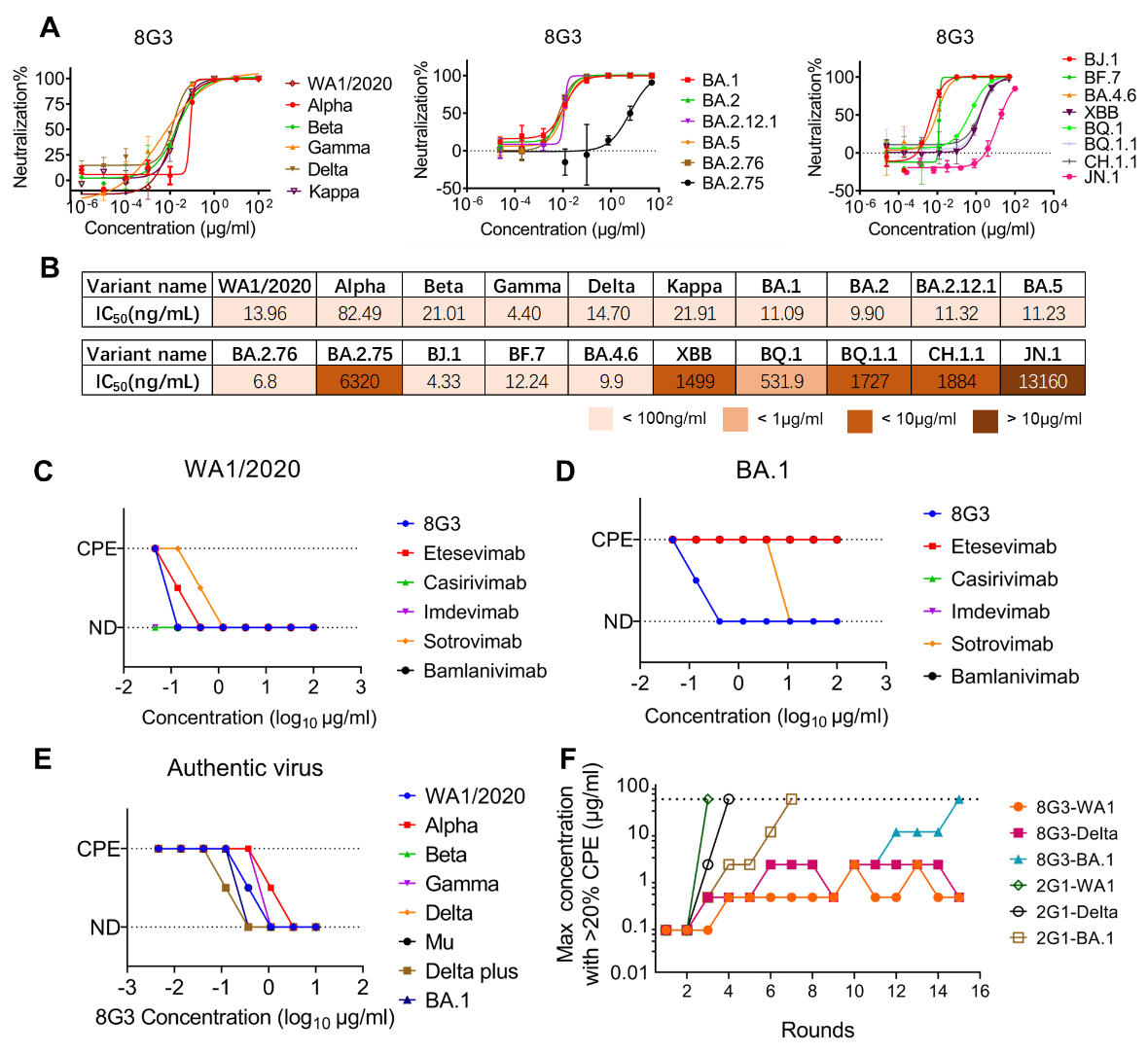 本研究从早期恢复期患者的体内分离出了一种强效的广谱中和抗体8G3。实验结果表明,该抗体在假型病毒和真型病毒的中和实验中,能够对多种SARS-CoV-2亚型展现出显著的中和活性,且对后期流行的变异株仍保持良好的中和效果(图1)。