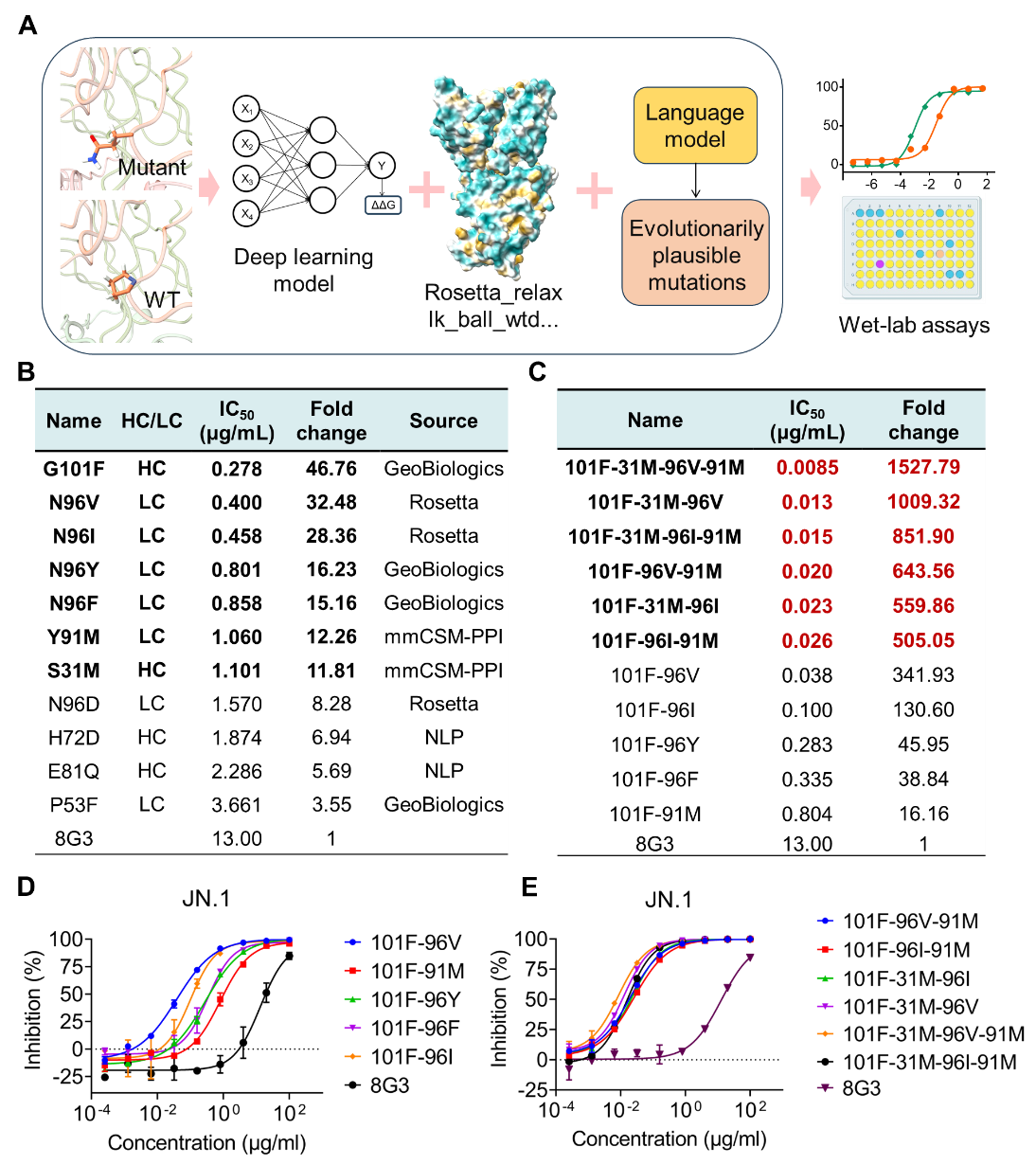为了解决抗体对最近流行毒株中和活性衰退的问题,本研究以近期流行的SARS-CoV-2 JN.1毒株为目标,结合神经网络深度学习及Rosetta等多种人工智能(AI)技术,结合能量及分子稳定性,分子及活性基团的疏水性等多种因素筛选了关键的点突变。实验结果显示,仅引入一个突变时,抗体对JN.1毒株的中和活性提高了约40倍;引入两个突变时,中和活性提高了超过300倍;最终,通过引入四个突变,抗体的中和活性提升了约1500倍,达到了同类抗体中的顶尖水平(图3)。