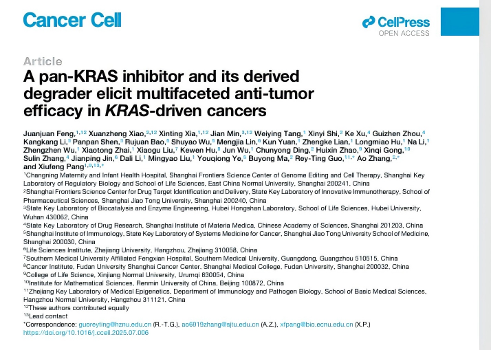 近日,yl23411永利集团官网张翱教授团队、华东师范大学逄秀凤教授团队、以及杭州师范大学郭瑞庭教授团队联合在Cancer Cell杂志(IF =44.5)发表题为“A pan-KRAS inhibitor and its derived degrader elicit multifaceted anti-tumor efficacy in KRAS-driven cancers”的研究论文(https://www.sciencedirect.com/science/article/pii/S1535610825003101)。该研究报道了一种可同时结合KRAS活性(ON)与非活性(OFF)构象的新结构泛KRAS抑制剂及其衍生的降解剂,二者均展现出针对多种KRAS突变体的广谱抑制效应,并在多种体内外模型中显示出显著的抗肿瘤活性。此外,它们在KRASG12C抑制剂耐药模型中依然保持活性,并具备增强抗肿瘤免疫反应的作用。