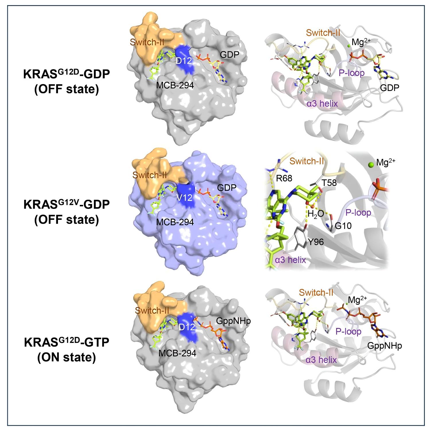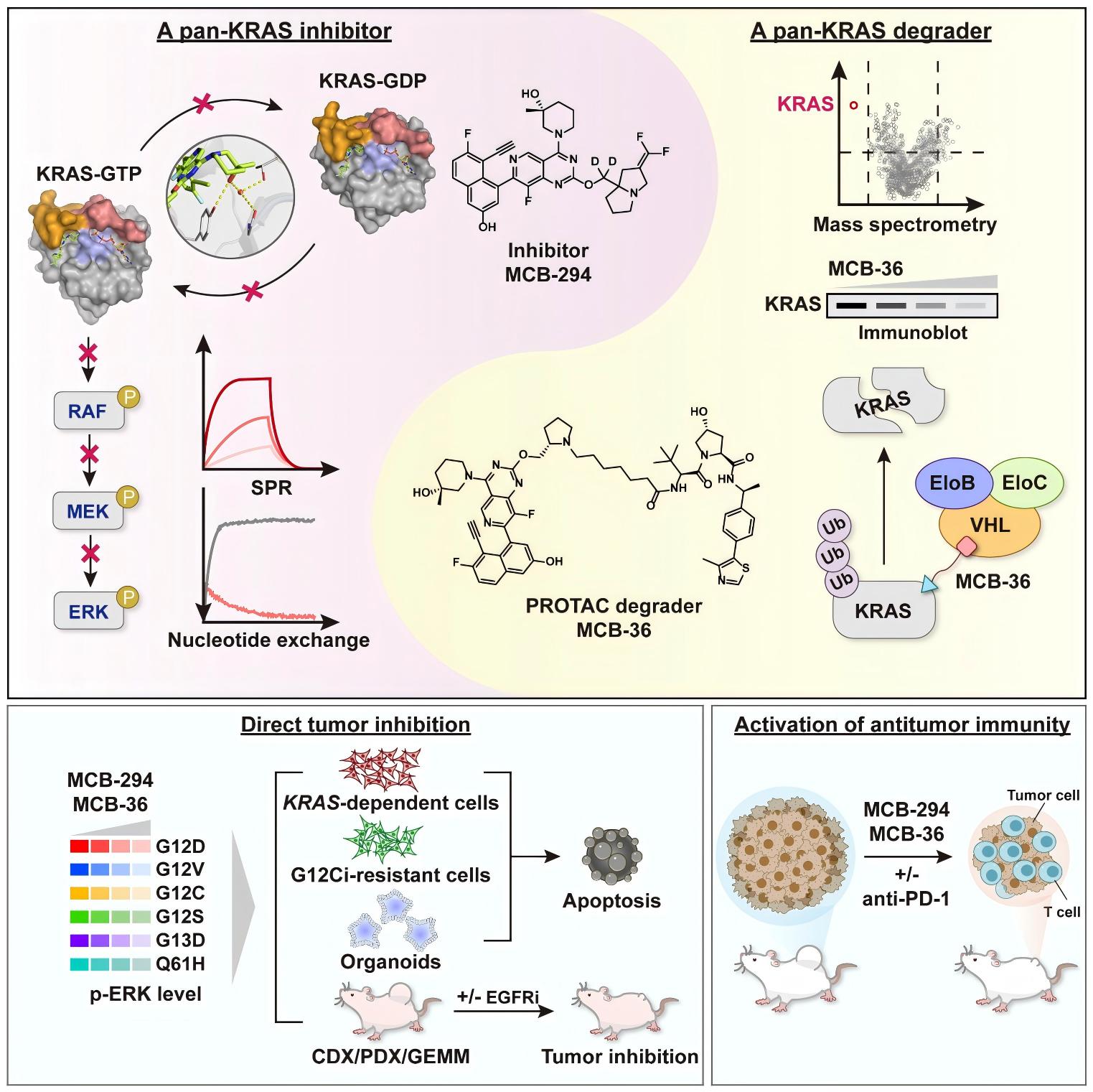综上所述,本研究开发的MCB-294作为双构象结合(ON和OFF状态)的泛KRAS抑制剂,实现了对KRAS突变的精准有效阻断;而MCB-36则通过靶向降解策略实现对KRAS蛋白的持续清除。两者分别代表“直接抑制”与“靶向降解”两种独立且互补的治疗策略,展现出重要的临床转化潜力。