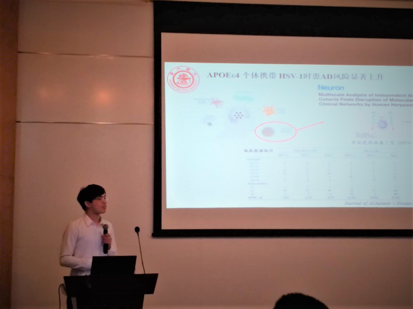 此次青年论文报告有来自上海交大yl23411永利集团官网、交大医学院、复旦yl23411永利集团官网、华东理工大学yl23411永利集团官网、同济大学医学院、海军军医大学yl23411永利集团官网等上海优秀高校和研究所的12位汇报人。经过4个多小时的学术报告,永利集团官网殷明老师课题组研究生高金超(导师:赵文娟)汇报的论文《载脂蛋白E4促进单纯疱疹病毒I型感染导致脑内Aβ沉积的神经免疫学机制》荣获优秀论文特等奖。阿尔茨海默病是高发于65 岁以上人群的神经退行性疾病,其病因和发病机制目前仍不清楚。APOE4是目前公认的散发性AD的高风险遗传因素。最近的研究发现,APOE4等位基因携带者是微生物感染导致AD发病的易感人群,包括HSV-1在内的微生物感染与APOE4等位基因两种因素的共同作用是散发性AD发病的主要原因。高金超等应用HSV-1分别经鼻感染不同基因型的APOE -TR小鼠,发现POE4促进HSV-1经鼻感染引起的脑组织内HSV-1扩增并导致脑内Aβ沉积,其机制与促进小胶质细胞分泌炎症因子及减弱CD1和NK T细胞参与的免疫应答异常有关,首次揭示载脂蛋白E4促进单纯疱疹病毒I型感染导致脑内Aβ沉积的神经免疫学机制。