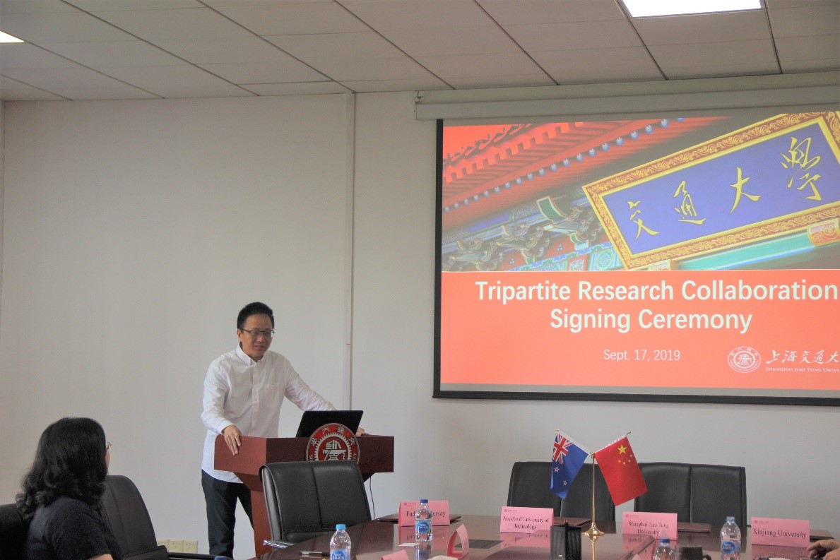 罗鹏代表上海交大向来宾表示了热烈欢迎。他表示,国际化是上海交大发展成世界一流大学的重要战略之一,希望以本次协议的签订为契机,提升和促进奥克兰理工大学与复旦大学、新疆大学和yl23411永利集团官网在科研方面的合作与交流。