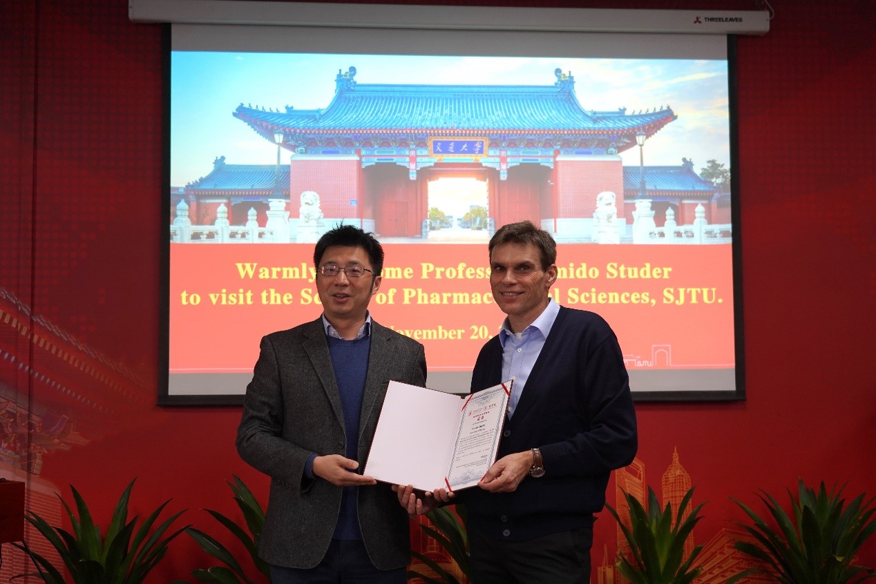 会后,王平代表学院向Armido Studer教授颁发了致远药学大师讲坛证书,并合影留念。