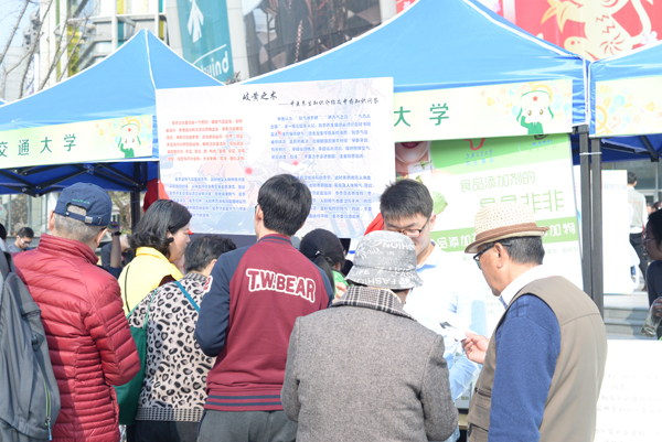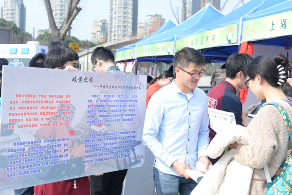 2016年3月5日雷锋纪念日,由闵行区文明委和上海市食品药品监督管理局主办的志愿服务活动在莘庄仲盛广场圆满开展。yl23411永利集团官网师生在主办方的邀请下,动员了院青志队以及“翡翠丝带”公益组织积极参与,以“岐黄之术——中医养生知识介绍及中药知识问答”为主题,为公益事业的传承与发展奉献了自己的绵薄之力。