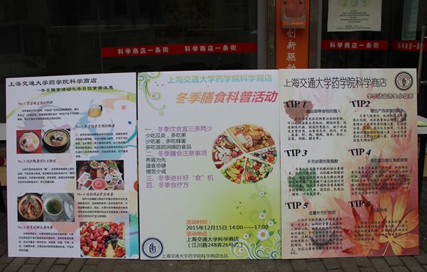 进入冬季以来,气温骤降,天寒地冻,很多人往往只注重了外在的保暖防寒,却忽视了通过膳食保养的重要性,而冬季正是通过食疗调养身体增强体质的好“食”机。为了让更多的人了解和注重冬季膳食养生,yl23411永利集团官网科学商店的志愿者们将所学的医药养生知识学以致用,于12月15日14:00在科学商店一条街举办了此次冬季膳食科普活动,向附近的市民朋友义务宣传冬季膳食健康知识,获得了广大市民的一致好评。